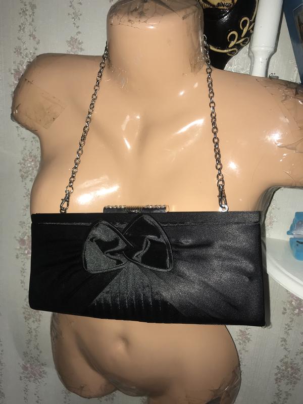 Чёрный атласный клатч в отличном состоянии. на застежке украшений стразами Размеры - 28*112,5 *2см. В комплекте съемная цепь Внутри общее отделение и кармашек под мелочь