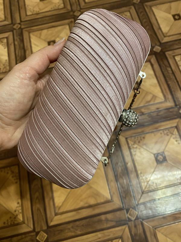 Сумочка клатч розового цвета, застегивается на защелку из камней, есть цепочка. Внутри розовая атласная ткань. Можно использовать как футляр для очков