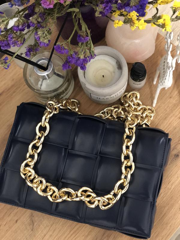 Сумка в стиле Bottega. Темно синего цвета Использовалась дважды в образах Выглядит как новая, никаких следов носки Качественная металическая цепочка Внутри одно большое отделение и одно маленькое на змейке.