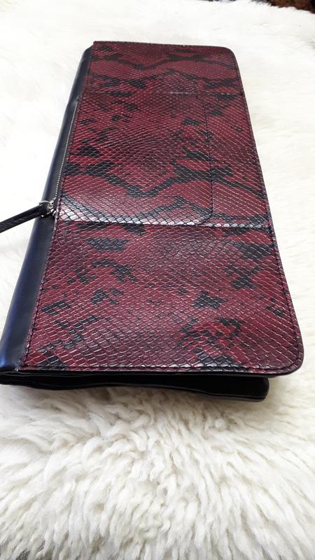 большая сумочка-клатч,состояние новой.Сделана на 70 % из мягенькой гладкой,качественной кожи. Отделка бордово-черная с змеиным принтом,отделка кожзам. Основной отдел с боковым карманом,еще отдел в середине складующей сумочки и на литцевой стороне отдельчик для мелочей. Все отделы закрываются на качественные металические замки молния. р-р 16 на 40 см. в разложенном состоянии 39 на 30 см.
