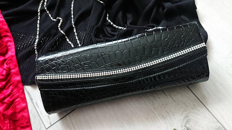 Клатч футляр с одним отделением. Держит форму. Теснение под рептилию. Есть длинный ремень в виде тонкой цепочки под серебро. Декорирован стразиками. Длина 30 см.