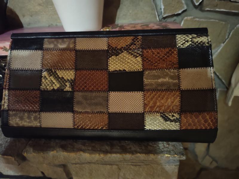 Сумочка выполнена из кусочков натуральной кожи рептилии. Очень эффектно смотрится. Застёжка из жёлтого метала.Внутренгя часть из плотного искусственного замша. Состояние новой вещи