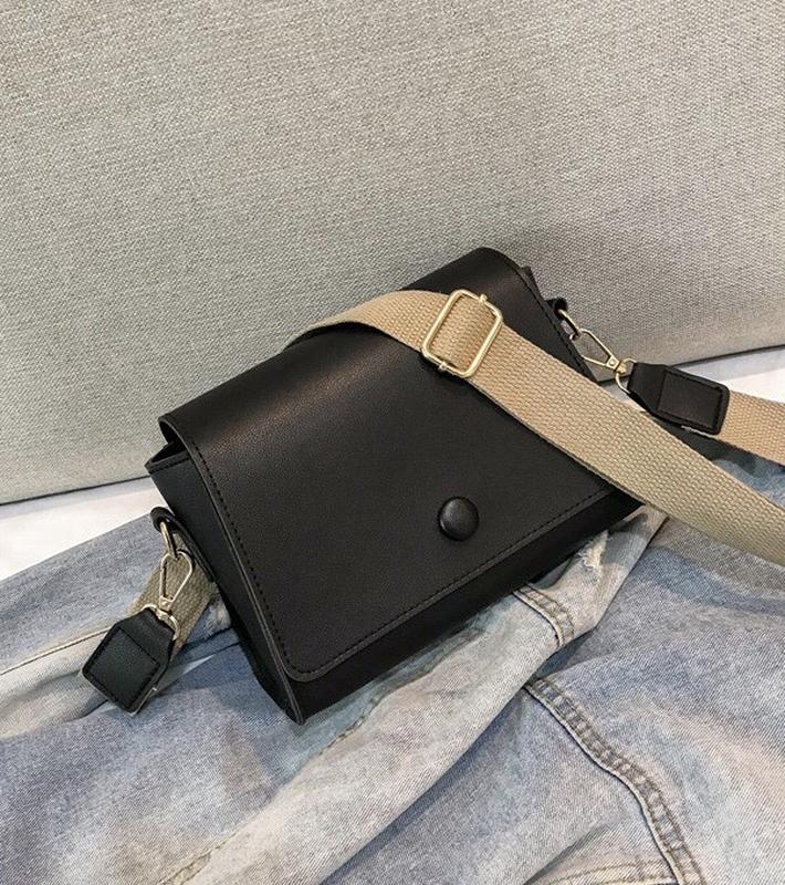 Міська сумочка крос-боді, з застібкою-кнопкою і текстильним плечовим ременем. Екошкіра, застібка на стильну шкіряну кнопку і блискавку всередені. Трендовий текстильний плечовий ремінь бежевого кольору. Одне внутрішнє відділення і кишеня біля стінки. РОЗМІР: Висота 12.5 см; Ширина 19.5 см; Ширина підстави 5 см; Плечовий ремінь 112 см. Колір: чорний Матеріал: еко-шкіра Розмір: міні Плечовий ремінь: з'ємний, регульований 112 см Фурнітура: світло-золотий метал ДxШxВ: 195x50x125 мм