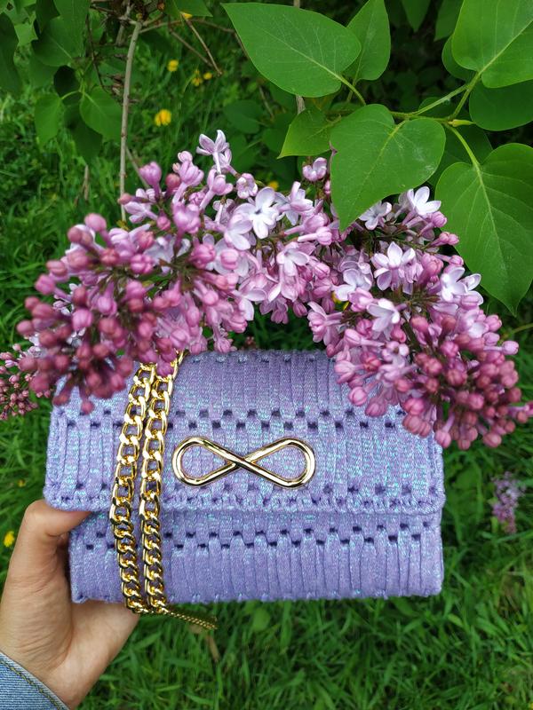 Сумочка з трикотажного шнура з люрексом на канві з довгим ланцюгом на магнітній кнопці