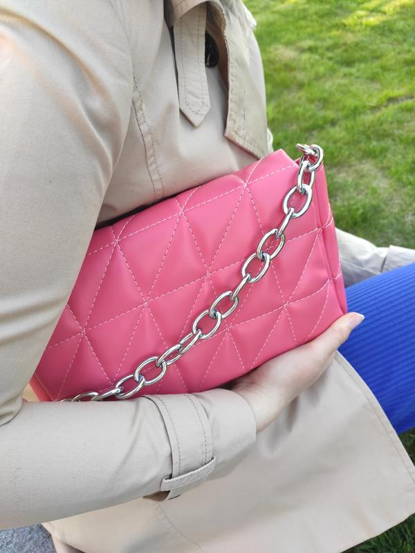 Сумочка середньго розміру, має довгий ремінець та ланцюжок. Актуальний стьобаний дизайн. Всередині сумочка на підкладці, має дві кишені та два відділення. Дуже зручна модель на кожен день Розмір : 26*18*6 Колір: рожевий