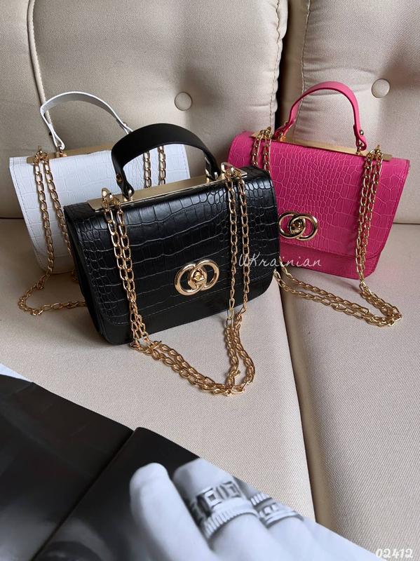 Сумка клатч в стилі шанель Шкірзамінник структура рептилія Одне відділення Всередині дві кишені Клапан на застібці Ланцюжок (101 см)перетворюється на дві ручки Висота ручок - 30 см Фурнітура золота 21,5*15*8 см Кольри: чорний, білий, фуксія