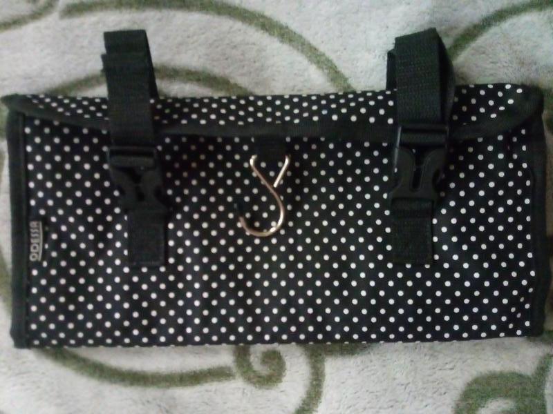 Роскладной органайзер,б/у но в хорошем состоянии.много отделений которые закрываются на молнию, крючок за который можно подвешивать. Длина в развернутом состоянии -68см,ширина-35см