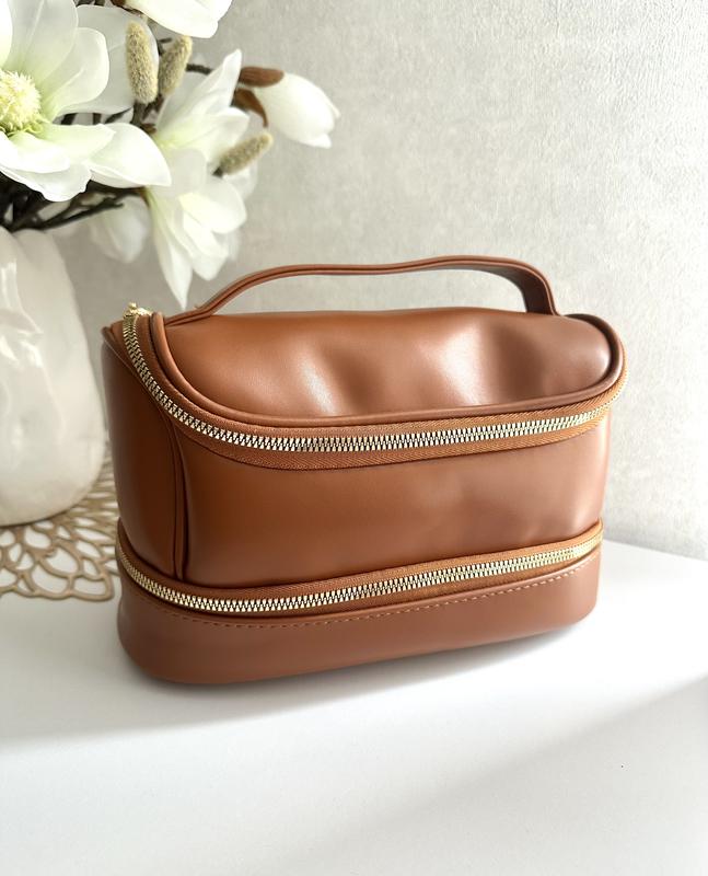 Очень классная удобная косметичка, абсолютно новая, в использовании не была. Цвет кэмэл. Замеры 25см * 17см * 11см Материал эко кожа