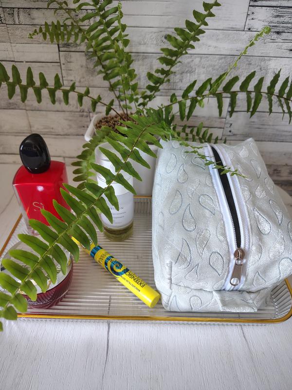 Поздравляю. Предлагаю вашему вниманию косметичку ручной работы. Содержимое, удобная, почти невесомая. Изготовлена из мебельной ткани нежного серого цвета с принтом капель, имеет подклад - х/б . Замеры: высота -10 см ширина -10 см длина - 17 см. Рекомендации по стирке - ручное или же деликатное- 30 градусов.