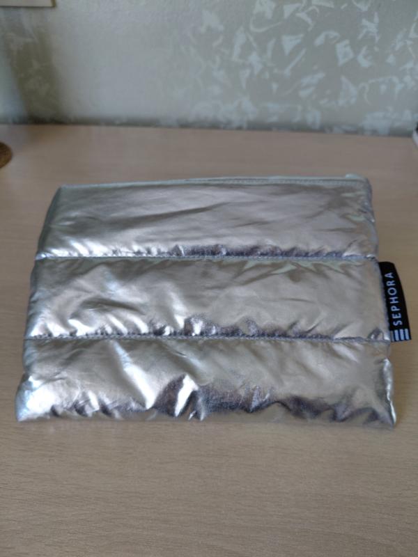 стеганая косметичка от люксового бренда косметики Sephora. мягкая косметичка серебристого цвета, на молнии. размер: 22 × 16