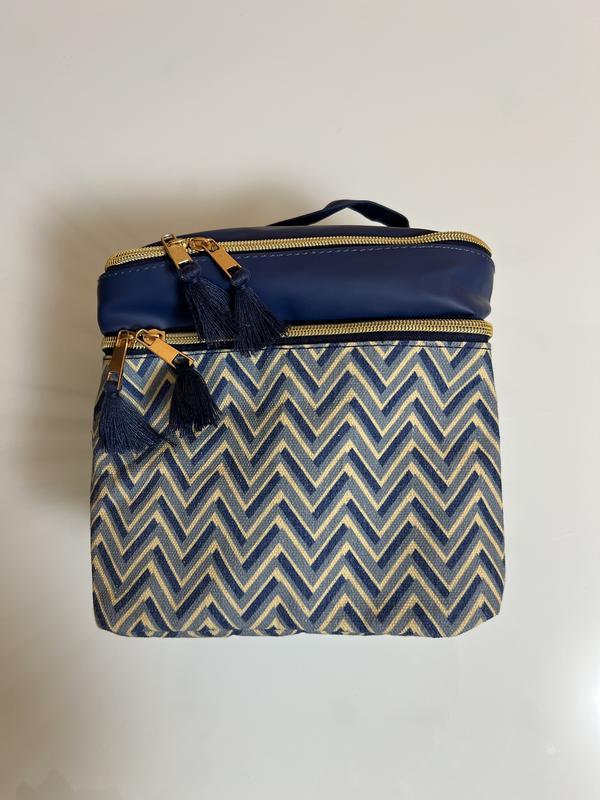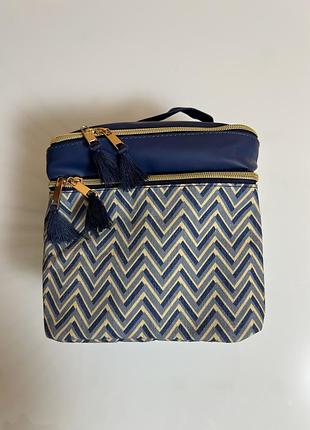 Код: 1200 Косметичка / органайзер для косметики Стильна та містка косметичка з двома окремими відділеннями на золотистих блискавках. Верх виконаний з гладкого матеріалу, нижня частина — щільна тканина з красивим геометричним принтом (синьо-бежевий зигзаг). Декорована китицями на замках, що додає елегантності. Зручна ручка зверху — легко брати з собою в подорож або сумку. Стан: нова Висота 20 см, ширина 20 см, глибина 14,5 см Ціна: 160 грн