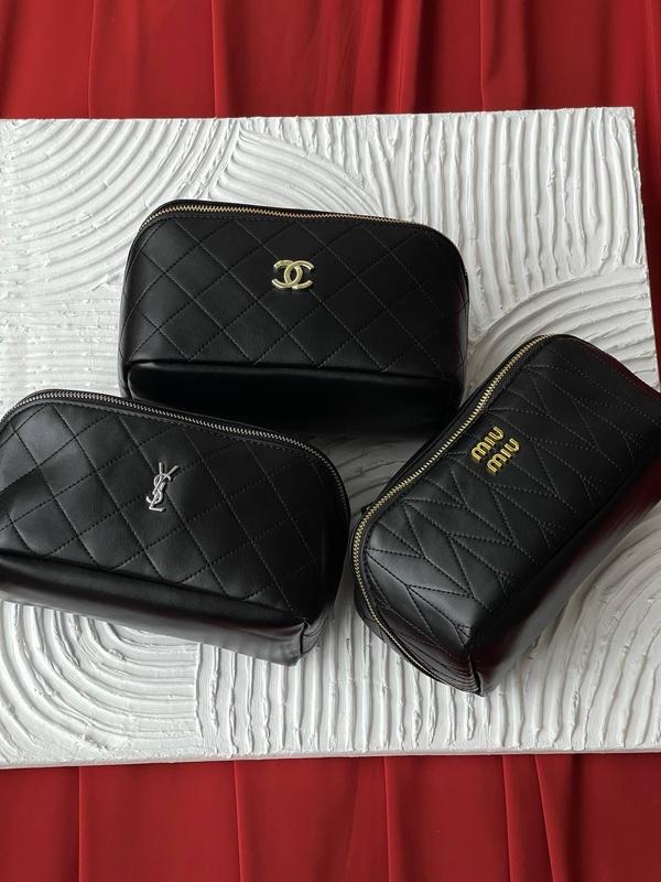 ▫️Жіноча косметичка Yves Saint-Laurent чорний срібло Chanel чорний золото Miu Miu чорний золото ▫️Має одну зручну ручку з тисненням логотипу. ▫️Всередині — одне велике основне відділення. ▫️З одного боку розташовані дві відкриті кишені, з іншого — кишеня на блискавці. ▫️Також по центру є ще одне відділення на блискавці, виконане з текстильної підкладки; перегородка розташована вище дна і не прошита до кінця, тому простір знизу залишається загальним. ▫️Косметичка оснащена биркою і QR-кодом. ▫️Фурнітура брендована, виконана в поєднанні золотого і срібного відтінків. ▫️Матеріал: єко-шкіра ▫️Розмір 22*12,5*11см ▫️Пильовик в комплекті