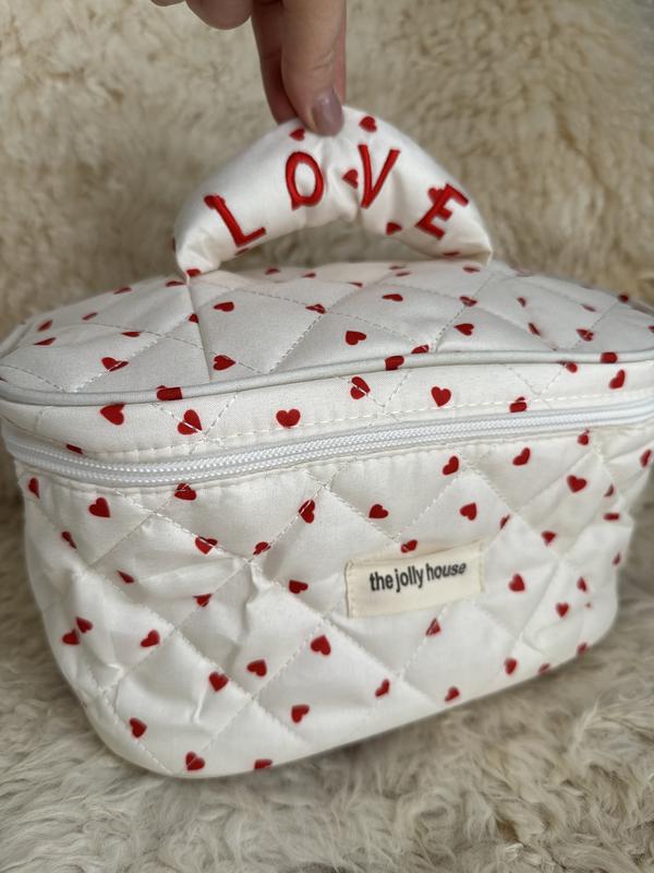 Стильна косметичка з романтичним принтом від бренду The Jolly House. • Колір: білий з червоними сердечками • Матеріал: щільна стьобана тканина • Ручка з написом "LOVE" червоними літерами • Внутрішнє відділення з кишенею на блискавці • Компактний розмір для щоденного використання • М'яка підкладка всередині Ідеально підходить для зберігання косметики, прикрас або дрібних речей. Акуратний стан, готова до використання.
