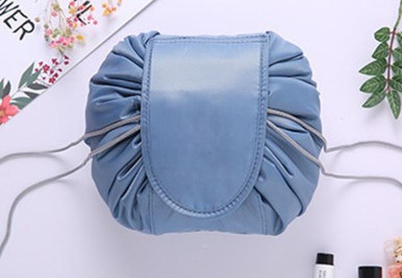Дорожная раскладная косметичка-мешок, диаметр в разложенном состоянии: 50 см. Имеется два кармана на молнии. После использования, все собирается в один компактный стильный мешочек. Цвет: розовый