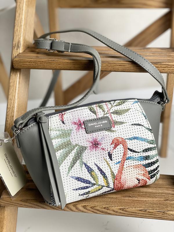 Женская сумка DAVID JONES 5923-1 Grey Упаковка: транспортная упаковка Материал: искусственная кожа Размеры: ширина 18,5 см, высота 15 см, толщина 9 см. Стильная женская сумочка через плечо, выполнена из искусственной кожи. Закрывается на молнию. Основное отделение обшито плотной текстильной подкладкой, в нем есть навесной кармашек без застежки и боковой отдел на змейке. Плечевой ремень регулируется. Декорирована сумка перфорированной вставкой с принтом.