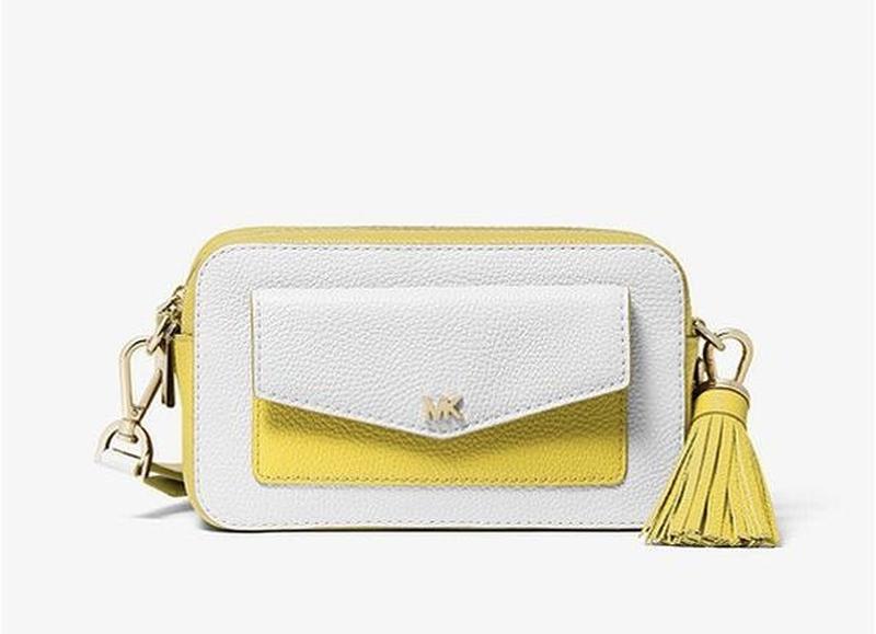 Сумка відомого американського бренду Michael Kors з натуральної шкіри, тримає форму. Біло-жовта, фурнітура золото. Брелок-пензлик знімається, може використовуватися для ключів. В гарній подарунковій брендовій коробці Michael Kors. Чудово на подарунок.