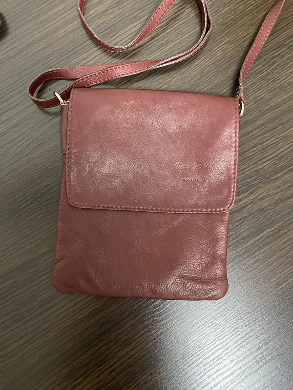 Кожаная сумка с регулируемым ремешком. Изготовлена в Италии. В середине кармашек на молнии. Размер: 22*18, длина ремня-130.