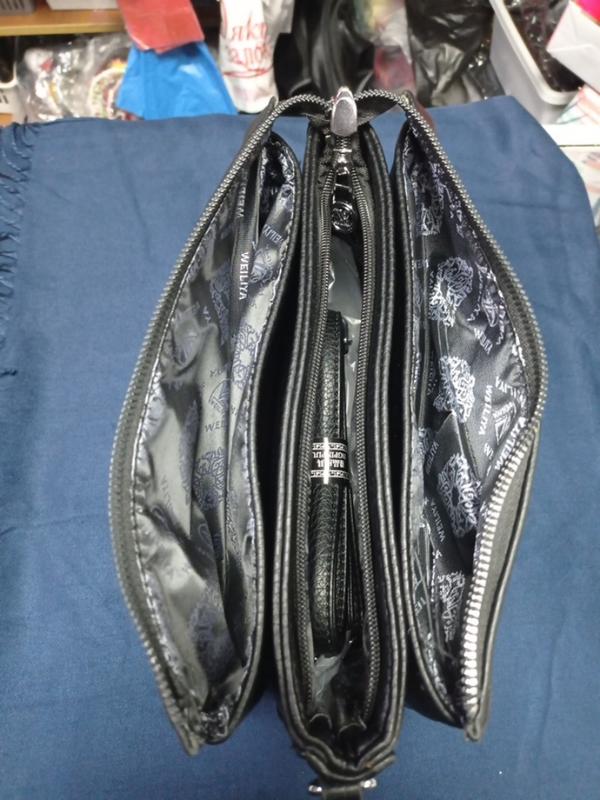черная сумка,маэ пять внутренних отделений,два отделения с застежками с боковых сторон, красивая на ощупь,ремешок регулируется,фурнитура добра, без лишних мелочей,стримана, удобная