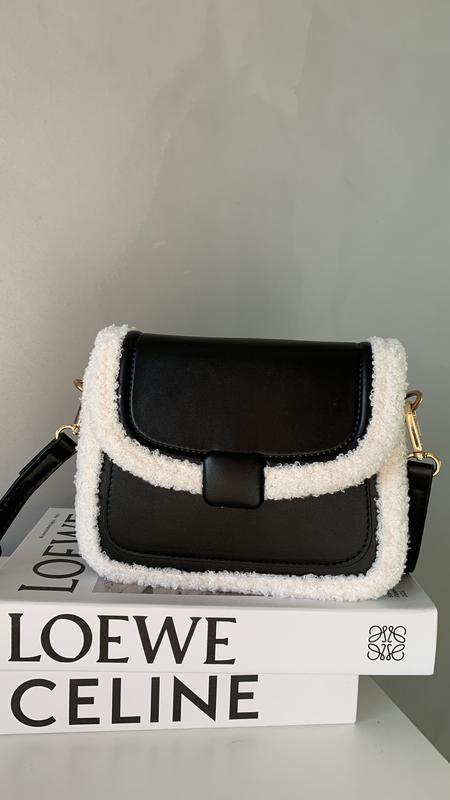 Сумка виконана із якісної еко шкіри. Приємне на дотик хутро Розміри : 20*16*8 см Всередині 2 відділення розділені третім на блискавці ,також є кишенька В комплекті йде регульований ремінь.