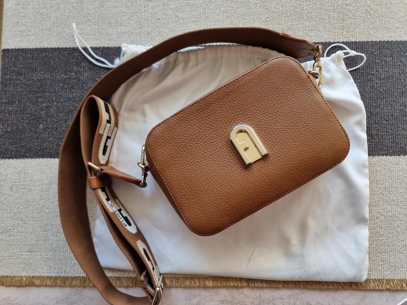 Кожаная сумка-кроссбоди бренда Furla (оригинал) с текстильным ремешком с логотипом бренда. Карамельный цвет, золотая фурнитура. На фурнитуре есть потертости, но все исправно. На фурнитуре лого бренда. На самой сумке отсутствуют повреждения или потертости. В комплекте есть брючина для хранения.
