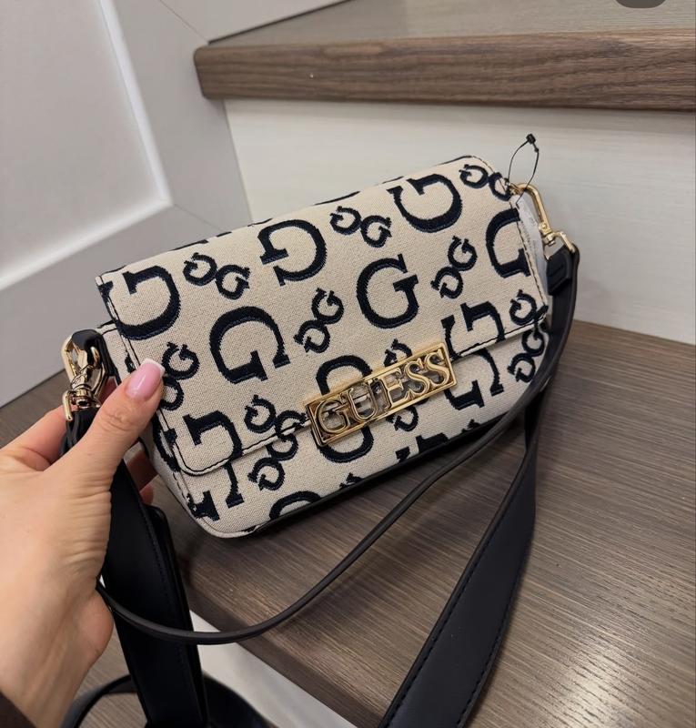 Елегантна жакардова сумочка Guess у молочно-синіх тонах із фірмовим логотипом. Металевий декор додає вишуканості, а зручний ремінець дозволяє носити її різними способами. Ідеальний вибір для стильних образів Оригінал, викуплена з офіційного сайту Колір бежевий , ремінець , дно сумочки та всередині темно синій колір Відправлю безпечною оплатою