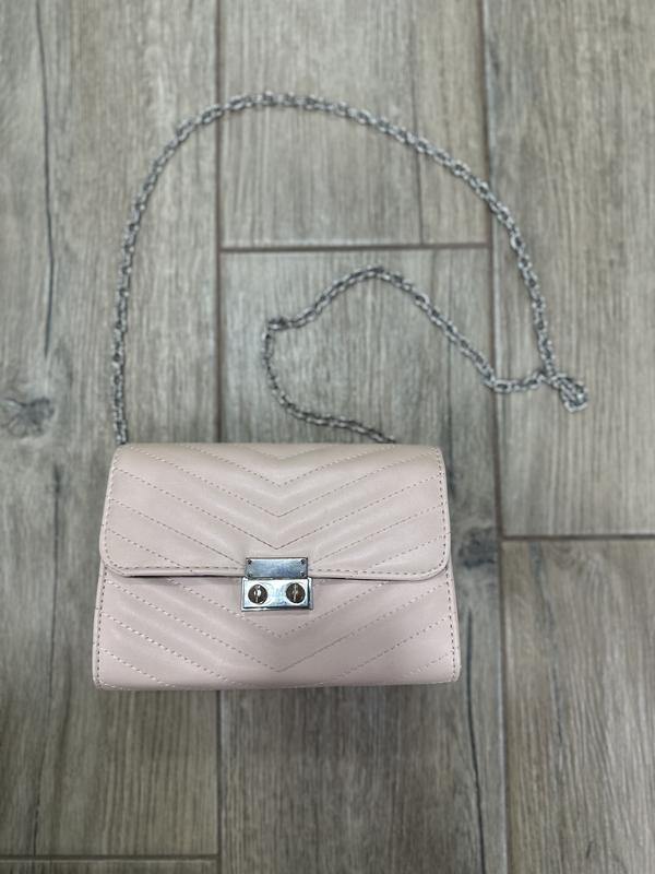 Гарна сумочка в пудровому кольорі на металевому срібному ланцюжку, класична форма, стан ззовні ідеальний, з нюансів, витерся срібний колір на кнопках застібки