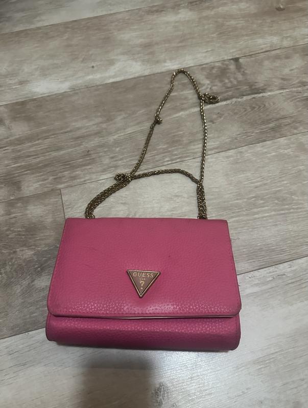 Маленька і вмістка сумочка guess Гарний рожевий колір Постану без нюансів (ціла,кутики цілі,кнопочка тримає добре) Потрібно просто для себе почистити і буде як нова В середині два відділення в перегородка на замочку(для дрібниць) Можна носити як на короткий так і на довгий ланцюжок Висота16 Ширина21 Глибина 6