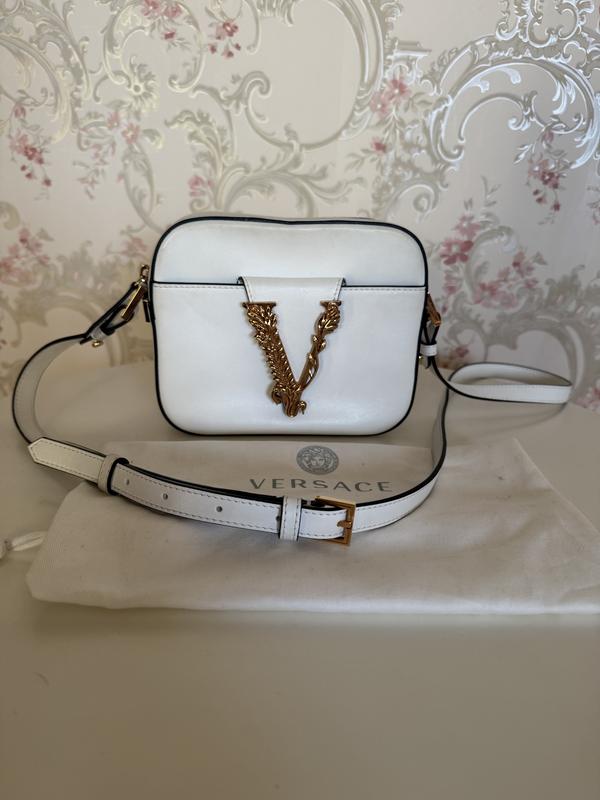 Оригінал,стан ідеальний,як нова.Лише кілька раз одягала.Натуральна біла (не молочна) шкіра,в середині теж натуральна шкіра чорного кольору,в середині є додаткова маленька кишеня для карточок.З боку також є додаткова кишеня на кнопці .Розмір сумки:18см-14.5см-6см.Довжина максимально ремінця -118см,можна ще зробити додат дірки,якщо потрібно.Місце для них є.Таклж можна його зменшувати.Є пильник і пакет фірмовий.