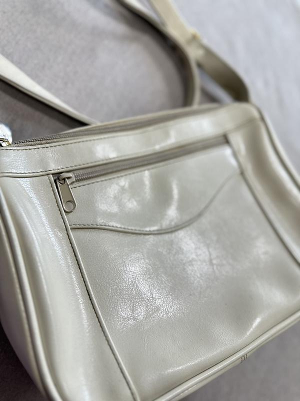 Ідеальний стан Дуже вмістка та мʼяка. Має два відділи, підкладка ціла та чиста Ремінець регулюється Висота - 20 см Ширина - 25 см Колір більше до слонової кістки