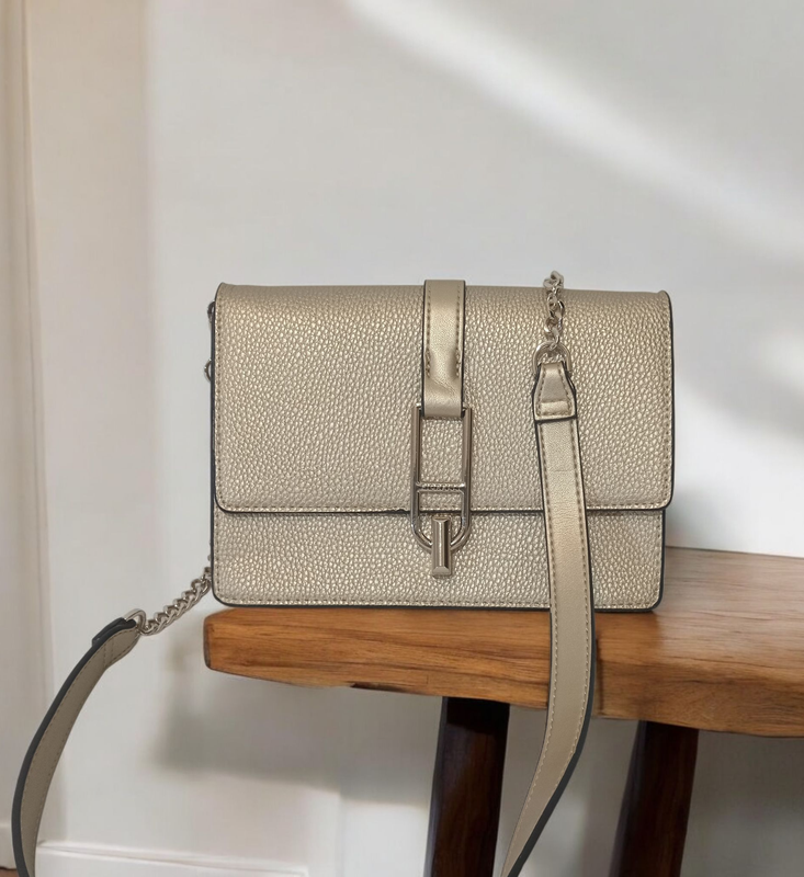 Стильная и элегантная сумка из качественной, мягкой экокожи. Фурнитура золотистый металл. Закрывается на замок. Ремешок с цепочкой сьемный. Можно носить через плечо и на плече. Внутри подкладка, одно отделение с карманчиком на молнии. Цвет - бежевого - золотистый. Состояние нового. Размер : ✔️ 20,5 см * 15 см ✔️ боковая сторона и дно 4 см ✔️ длина ремешка 103 см