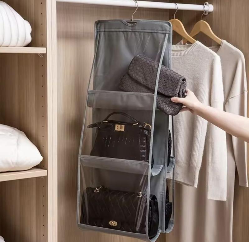 Подвесной органайзер для сумок - идеальное решение для организации вашего шкафа и хранения сумок. Это супер полезная вещь, которая помогает сэкономить пространство. Прекрасно помещается в шкаф, не занимает много места, при необходимости компактно складывается. Внешняя сторона органайзера выполнена из прозрачного материала, который позволяет видеть содержимое. Размеры отделений идеально подходят для сумок, но могут использоваться и для хранения других вещей.