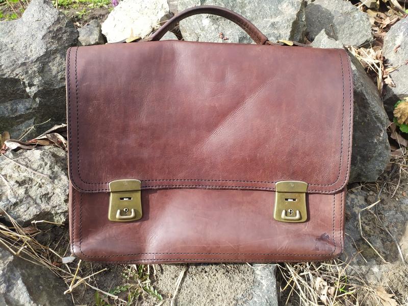 портфель сшит из кожи crazy horse, на которой при носке остаются царапинки и механические повреждения. на левом нижнем углу с боковой стороны есть царапины - на фото. кожа плотная! закрывается на две защёлки, ключа нет. внутри три больших отделения и два больших отделение на змейках YKK. размер 40х31х13см без учёта ручки. высота с ручкой 37см