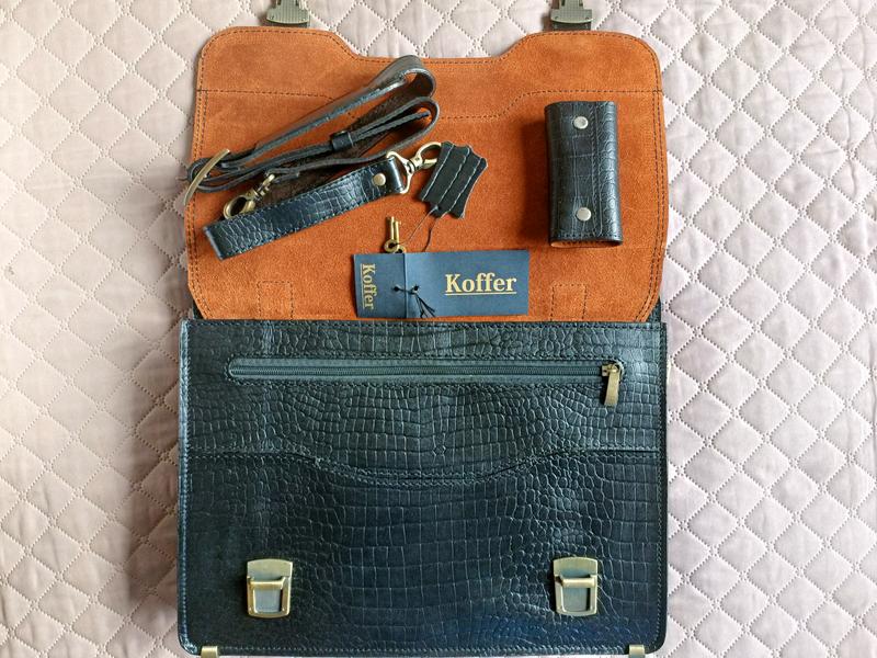 Made in USA, Натуральная кожа. Новый, полный комплект: портфель, плечевой ремень, кофр для ключей, два ключа к замкам, упаковочный мешочек.