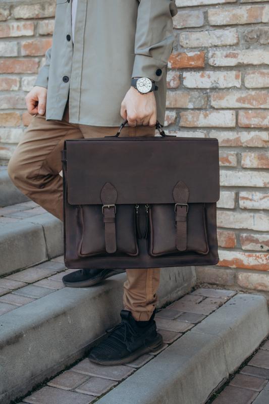 Кожаный мужской портфель Бронкc - лучша модель в линейке деловых сумок для каждодневного пользования. Особенности кожаной сумки: натуральная телячья кожа Crazy Horse с винтажным эффектом; металлическая фурнитура цвета состаренной бронзы; сумка закрывается на крышку с двумя портфельными замками; для удобства переноски на крышке установлена крепкая ручка с металлическими рамками; сумка комплектуется кожаным плечевым ремнём с функцией регулировки по длине; на лицевой части сумки два отдельных кармана на молнии; на задней стороне широкий внешний карман на молнии; внутри одно большое отделение с перегородкой; на перегородке внутренний карман для телефона и документов. Размеры: (см): ширина 38, высота 27, толщина 10. для документов А4 или нетбука 13.5 дюймов (см): ширина 42, высота 32, толщина 10 под ноутбук 15.5 дюйма +10% к стоимости (см): ширина 46, высота 33, толщина 10 для ноутбука 17 дюймов +20% к стоимости 🔸ПЕРСОНАЛИЗАЦИЯ🔸 Для заказа лазерной гравировки изображения или текста, комбинации цветов кожи или корректировки размеров сумки сообщите информацию менеджеру при обсуждении заказа. 🔸ДОСТАВКА🔸 Сумки от бренда SharkyFriends производятся персонально для клиента. Срок пошива изделия 3-5 рабочих дней. После отправки срок доставки по Украине 1-2 дня, в другие страны 10-15 дней.