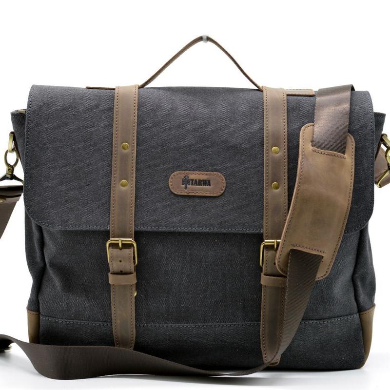 Класична чоловіча сумка-портфель з парусини з шкіряними вставками RG-0001-4lx від українського бренду TARWA. Аксесуар можна носити в руці і за допомогою плечового ременя. Аксесуар відмінно підійде для роботи і навчання.