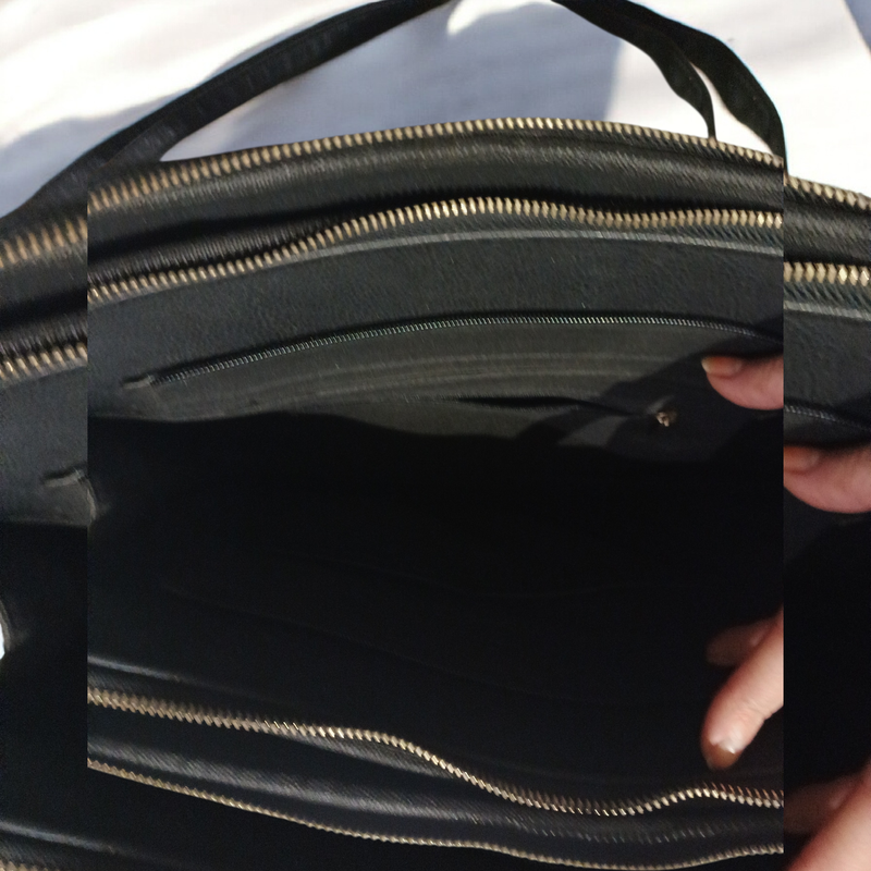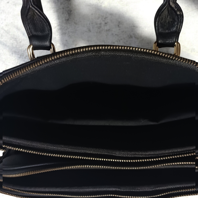 черная женская сумка-портфель (саквояж) из текстурированной искусственной кожи с логотипом JGL. Сумка имеет две верхние ручки, съемный плечевой ремень и золотистую металлическую фурнитуру, включая декоративную круглую подвеску с логотипом.Имее очень много отделов, карманчиков Размер 35см на 25см Есть дефекты на фото видно
