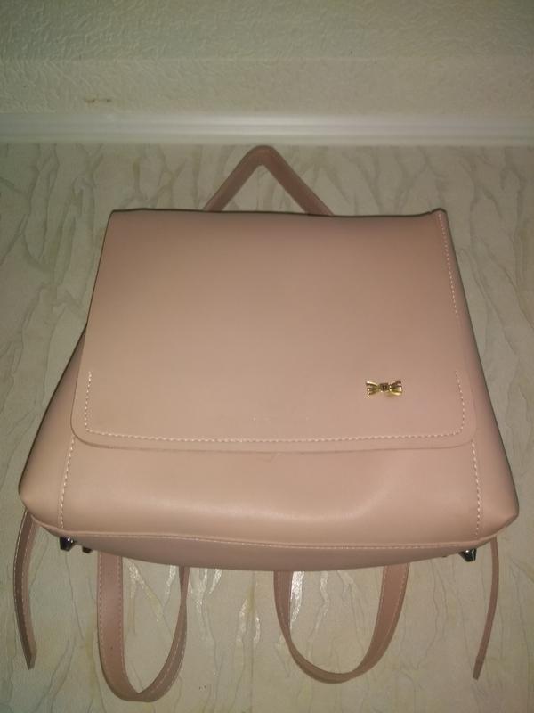 Стильний,красивий жіночий рюкзак,можна носити як сумку(еко шкіра),тримає форму.Всередені велике відділення та, великий гаманець на блискавці,який знімається(на кнопках),На підставі-маленькі металеві ніжки, довжина лямок регулюється.Рюкзак ніжно-рожевого (пудрового)кольору,виглядає ефектно та стильно.Розмір 28;26,5;10