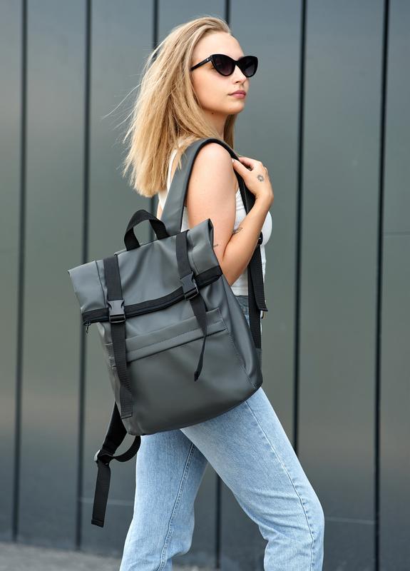 Рюкзак ролл вместительный, под ноутбук Sambag унисекс RollTop Milton - графитовый Рюкзак коллекции Roll создан для нужд города: прогулок, работы, учебы, спортзала, урбан путешествий, весеннего и летнего отдыха. Вместительный и функциональный помощник помещает все необходимые вещи каждый день. ✅ Характеристики: Материал верха: Новейшая экокожа повышенного уровня износостойкости (не менее 50 000 циклов по тесту Мертиндейла). Кожа водоотталкивающая, устойчивая к выцветанию, эластичная (не трескающаяся при эксплуатации) и прочная на разрыв. Спинка держит форму: уплотнена пеноматериалом и снаружи выполнена из вентиляционного материала AirMesh 3D. Подкладка: Материал оксфорд средней плотности, прочный, водостойкий, стойкий к царапинам, легко чистится, нити из него не вылезают. Благодаря соединению всех частей подложки между собой, нагрузки на экокожи уменьшаются и распределятся равномерно. Это продлевает срок службы кожи и швов извне. Фурнитура: Молнии типа YKK из надёжного пластика. Бегунки с фиксатором: рюкзак не откроется самостоятельно от нагрузок, а только рукой. Установлены два магнита, благодаря чему рюкзак сверху всегда держит форму как на фото. Ременная лента с фастексами регулируется с увеличением высоты рюкзака. Основное отделение на молнии. Подтяжки: Плечевые ремни кожаные, мягкие, надёжно пришиты на планку по спинке. Присоединены к бокам кожаными треугольниками. Длина регулируются при помощи трехщелков. Функциональность: Снаружи рюкзака спереди один карман. Два кармана по бокам на молнии. Внутри рюкзака отдельное отделение под ноутбук до 14 дюймов (зависит от пропорций экрана и рамок вокруг него – при заказе уточняйте размер гаджета). Отделение надёжно защищено пеноматериалом по всей высоте гаджета. С другой стороны середины карман на молнии и один открытый карман. 📐 Размер: 41*30*16 в свёрнутом виде (смотр. главное фото), в максимально развёрнутом виде габариты рюкзака составляют 54*30*16( см. дополнительные фото). Рюкзаки доступны во всех цветах. 🚚 Отправляем: Новая Почта, УкрПочта (безопасная сделка, оплата на карточку или наложенным платежом)