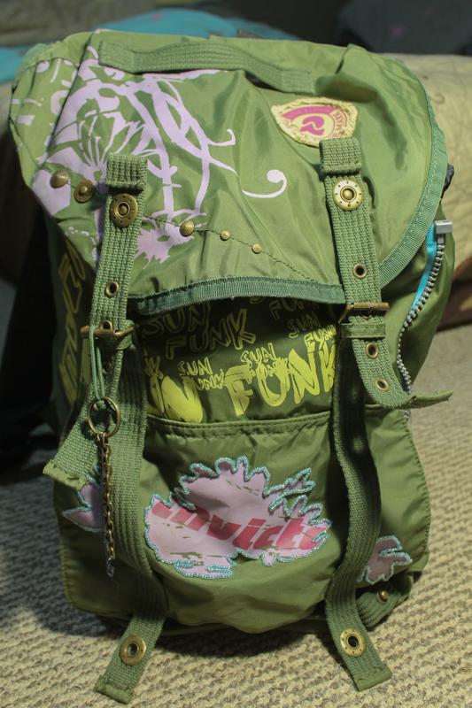 Дуже великий вмісткий рюкзак. Недолік видно на фото. За потреби регулюється розмір і брительки. Є 2 великих відділення, які закриваються на нитці. Та невелике відділення внизу. Підходить як для навчання так і для походів