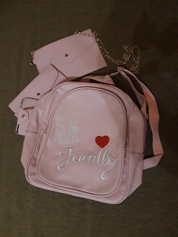 Стильний рюкзачок для дівчинки з 3х предметів. Розмір 25х30х12 Є незначний дефект: перепечатка фарби всередині бойового карман (показано на фото 3)