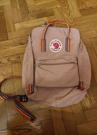 новый оригинальный рюкзак нежно-розового цвета FJallraven Kanken. длина 40 см, ширина 30 см. есть два кармана по бокам, один спереди на молнии, а также внутри есть 1 внутренний карман. рюкзак имеет радужные шлейки, можно носить и как сумку, и как рюкзак. шлейки можно отрегулировать
