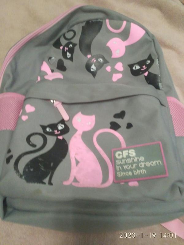Рюкзак на девочку подростка. Цвет светло серый с розовыми вставками. Внутри одно большое, глубокое отделение. Плюс один глубокий карман. Спереди один карман на молнии. По бокам два кармана. Сзади карман на молнии. Молнии целые. Размеры: длина рюкзака 43 см., ширина - 28см, боковая ширина -12см. Состояние отличное.