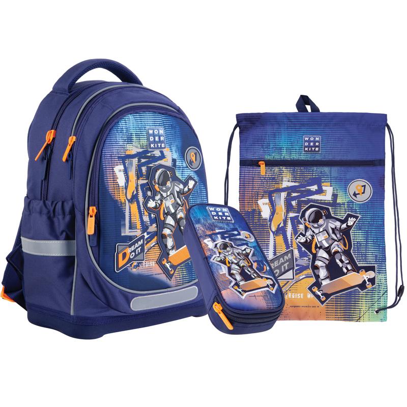 Школьный набор Wonder Kite – идеальное предложение для начальной школы. Все самое лучшее из коллекции Kite собрано в образцовый премиум-комплект «рюкзак + пенал + сумка для обуви». Люксовое качество, уникальный дизайн и расширенный функционал. Wonder Kite – это гордость бренда и вишенка на торте всей школьной коллекции. Вместе с рюкзаком вы получаете пенал и сумку для обуви! 1. Школьный рюкзак Kite – компактная и легкая полукаркасная модель, выполненная из прочного полиэстера. Продуманная организация пространства с удобными функциональными карманами и отделениями позволит поддерживать содержимое рюкзака в порядке. Стильный дизайн с эффектным декором будет вдохновлять и мотивировать учиться с радостью. 3 сменных бейджа на липучке можно менять под настроение. Ортопедическая конструкция обеспечивает максимальный комфорт для ребенка и способствует поддержанию правильной осанки. Модель одобрена немецкими институтом здоровья и эргономики IGR, адаптирована под возрастные и физические особенности школьников. Рекомендована для детей возрастом 6-8 лет и ростом 115 – 130 см. Рюкзак Kite снаружи: запатентованная ортопедическая спинка Ergo Back с мягкими дышащими подушечками повторяет природные изгибы спины; комфортные дышащие лямки S-образной формы снижают нагрузку на плечи; съемный нагрудный ремень фиксирует лямки и равномерно распределяет вес; большой фронтальный карман на молнии; 2 боковых кармана на резинке для бутылочки с водой или небольшого термоса; мягкая уплотненная ручка-переноска; текстильная ручка-петля; устойчивое и износостойкое фигурное EVA дно; светоотражающие элементы с 4 сторон – чтобы ребенка было видно в темное время суток; надежная фурнитура – молнии работают плавно, пуллеры с резиновым напылением; декор: принт; объемные резиновые бейджи. Рюкзак Kite внутри: 2 просторных отделения; карман для планшета с мягким плюшем внутри для бережного хранения гаджета; карман для телефона с плюшевой вставкой для защиты экрана; внутренняя система разделителей с фиксирующей резинкой – для тетрадей и книг; удобная съемная ключница; поле для персональных данных владельца; иконки внутренней навигации, подсказывающие предназначение каждого кармана; прочная брендированная подкладка оранжевого цвета. 2. Текстильная сумка для обуви Kite – удобный аксессуар для транспортировки и хранения сменной обуви и одежды. С двух сторон затягивается шнурками с фиксаторами и превращается в мини-рюкзачок, который можно носить за спиной или на плече. В сложенном виде помещается в кармане. Прочный износостойкий полиэстер выдерживает нагрузку на разрывы, принт устойчивый к выгоранию. Сумка для физкультуры легко стирается руками, быстро высыхает и долго сохраняет свой первоначальный вид. Особенности: 1 отделение; 1 вместительный передний карман на молнии; петля для вешалки; застежка – шнурки с фиксаторами; материал – полиэстер; размер: 46x33. 3. Школьный пенал Wonder Kite – компактный и вместительный, с эластичными фиксаторами для письменных принадлежностей. Особенности: 1 объемное отделение на молнии – чтобы все необходимое всегда было под рукой; резинки для фиксации канцелярских принадлежностей – для идеального порядка внутри пенала; декор: принт, объемные нашивки, контурная вышивка, 3D раббер бейдж с логотипом.