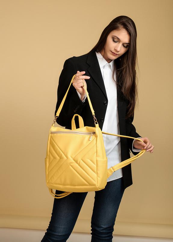 Рюкзак-сумка Trinity - это лучший вариант для людей, привыкших к стильной и активной жизни. Эта модель сочетает в себе разные стили, ведь Trinity можно носить как рюкзак и как сумку - это практично и удобно. Характеристики: Материал верха: новейшая экокожа повышенного уровня износостойкости (не менее 50 000 циклов по тесту Мертиндейла). Кожа водоотталкивающая, устойчивая к выцветанию, эластичная (не трескается при эксплуатации) и прочная на разрыв. Подкладка. Материал оксфорд средней плотности, прочный, устойчивый к царапин, легко чистится, нитки из него не выбираются. Благодаря соединению всех частей подкладки между собой, нагрузка на экокожу уменьшается и распределятся равномерно. Это продлевает срок службы кожи и швов извне. Фурнитура. Молнии типа YKK из надежного пластика. Бегунки металлические с фиксатором: рюкзак не откроется самостоятельно от нагрузок, а только рукой. Основное отделение на молнии. Шлейки. Плечевые ремни кожаные, надежно пришитые на планку по спинке. Присоединены к бокам кожаными треугольниками. Шлейки регулируются с помощью металлических регуляторов. Отдельная шлейка на карабинах, для удобного ношения на плече. Функциональность. Внутри рюкзака отдельное отделение под ноутбук до 15 дюймов (зависит от пропорций экрана и рамок вокруг него – при заказы уточняйте размер своего гаджета). Отделение надежно защищено пеноматериалом по всей высоте гаджета. С другой стороны, середине карман на молнии и один открытый карман.по бокам два открытых кармана для разных мелочей. Снаружи на спинке рюкзака есть один карман на молнии. Рюкзаки доступны во всех цветах.