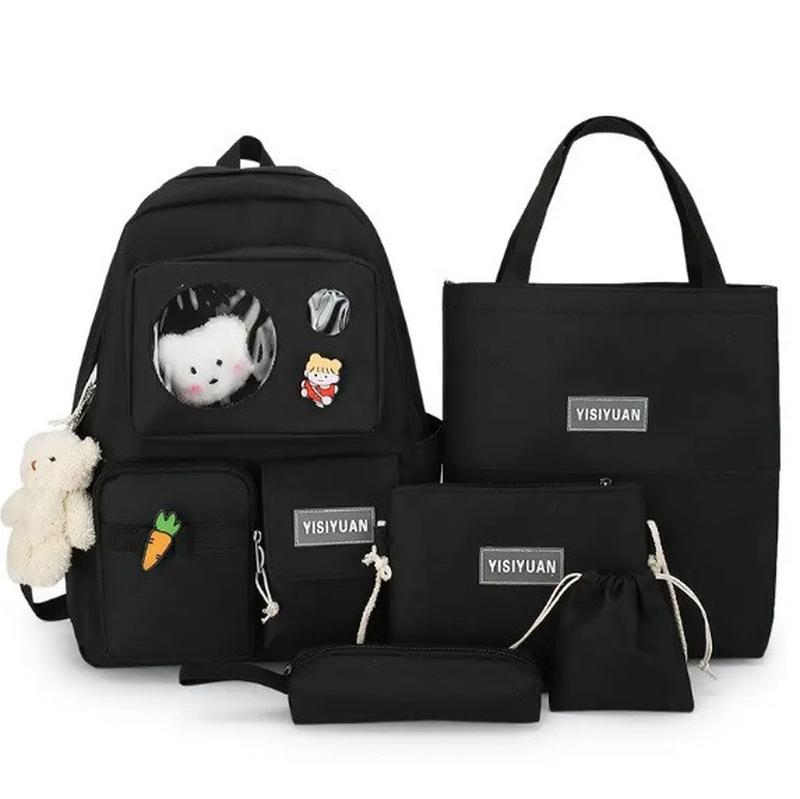 Женский рюкзак комплект 4 в 1 имеет несколько особенностей: - В середине рюкзака есть одно отделение, разделенное на две части. Это позволяет удобно организовать и разделить вещи. - На передней части рюкзака есть карманы. Это предоставляет дополнительное пространство для хранения и легкий доступ к мелочам. - Рюкзак поставляется в комплекте с брелоком мишкой и значками. Это милые аксессуары, которые придают рюкзаку уникальный стиль. - Материал рюкзака изготовлен из полиэстера. Полиэстер обладает хорошей прочностью и устойчивостью к износу, что делает рюкзак долговечным. Размеры этого рюкзака: - Высота: 43 см - Ширина: 30 см - Глубина: 14 см Этот рюкзак предлагает практичное использование с удобным внутренним разделением, дополнительными карманами для организации вещей, а также поставляется вместе с аксессуарами для добавления стиля.