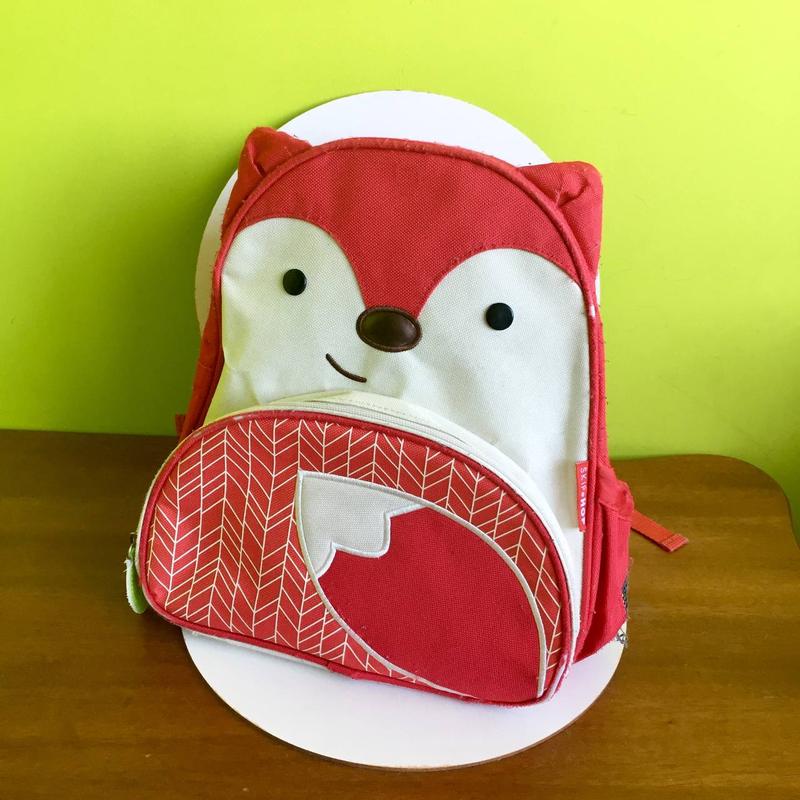 Рюкзак SkipHop/ "лисичка". Характеристики: Размер: 29х12,7х30,5 см Производитель: Skip Hop, США Особенности: - Содержимое главное отделение - Отделение для ланча с дополнительным карманом - Карман - сеточка для бутилочки с водой или термоса - Оснащен мягкими регулируемыми ремнями Нюансы: есть потертости, катышки, дырочка на сеточке карманы для воды. Внутри целый, чистый, фурнитура работает. Отдельно продаю рюкзак "розовая мышка", носили близнецы.