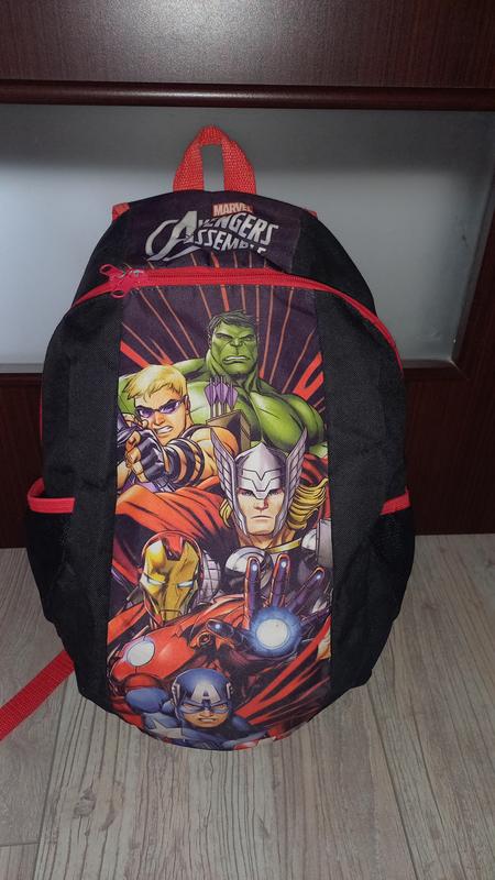 Avengers Marvel рюкзак.З орто спинкой, усиленное прорезиненное дно. Включает одно большое отверстие для вещей и 2 боковых кармашки.Очень вместительный.Стан почти отличный. Высота 50 см до ручки.