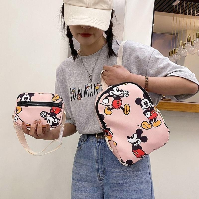 В наличии Милый тканый рюкзачок 2в1 с мики-маусом, дополнительно крепится маленькая сумочка. Идеальный вариант для садика и прогулок. В рюкзаке одно большое отделение 26*19*19см. Замеры меньшей сумочки: 11*17см.
