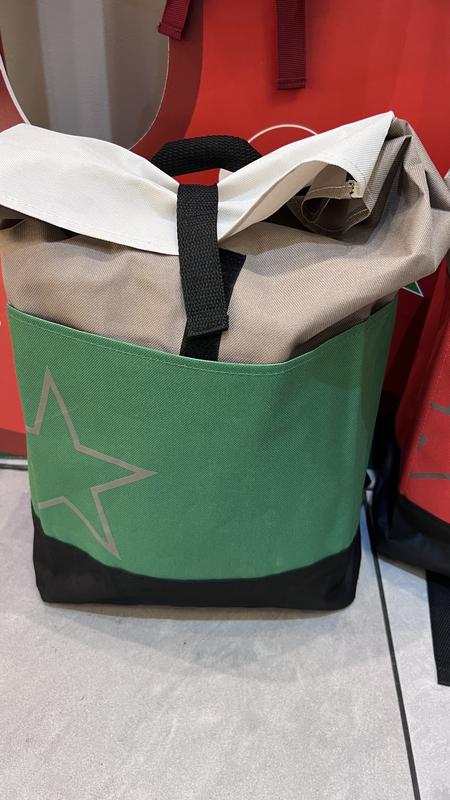 Очень удобный. Там где зелёный цвет- там карман. И сзади карман на змейке