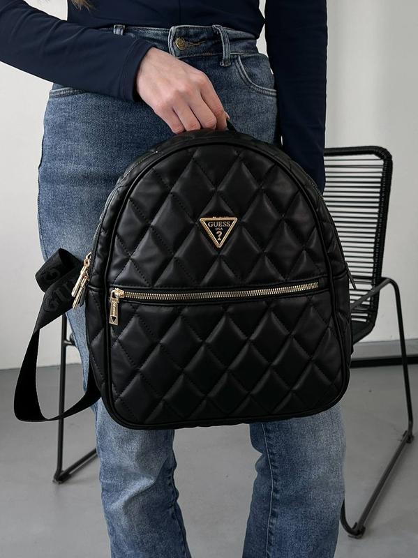 Guess Leather Backpack Black Размер: 32 х 28 х 11 см Материал: эко кожа Описание: Люкс качество! Рюкзак выполнен из гладкой прошитой нитью эко кожи. Очень приятная на ощупь. Спереди есть металлический логотип бренда. Рюкзак имеет два отделения. Одно основное большое с небольшим карманчиком на молнии. Второе впереди небольшое отделение на молнии. Внутри отделений брендовая текстильная подкладка. 1266
